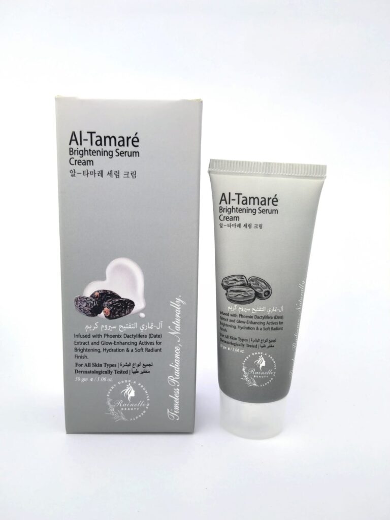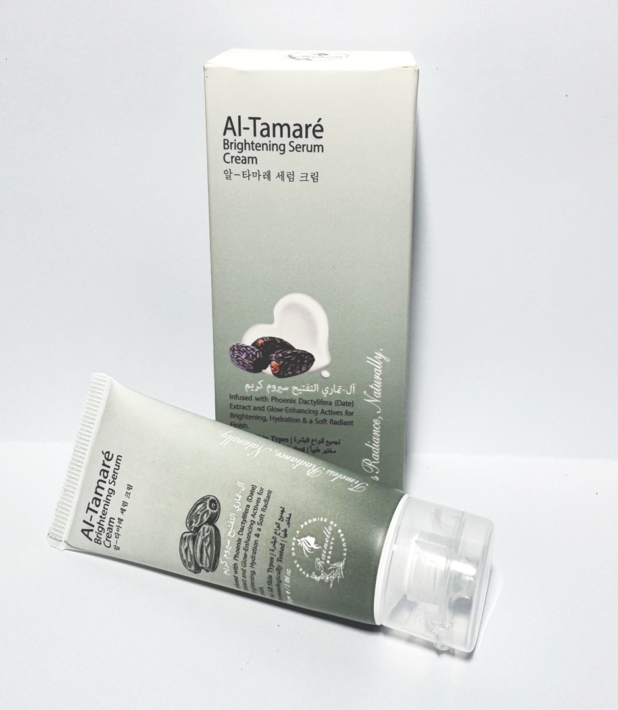 Al-Tamaré Brightening Serum Cream is a luxurious, silky cream enriched with Phoenix dactylifera (Date) Extract and powerful brightening actives including Niacinamide, Alpha-Arbutin, Ascorbyl Glucoside, Licorice Root Extract, Kojic Acid, and Glutathione. It deeply nourishes, brightens, evens skin tone, hydrates, and restores radiance.